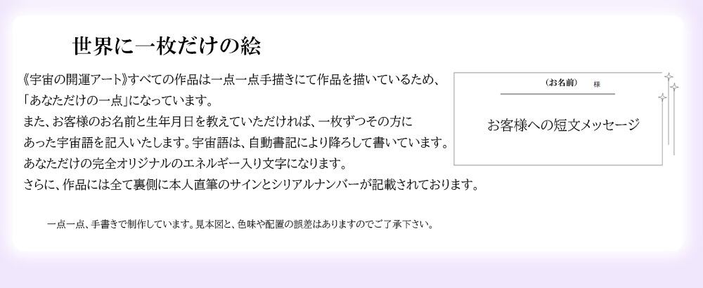 “叶えたい願い事を叶えられる”と言われる力をもった開運アート&宇宙語になっており、あなただけのオリジナルの1枚になっています。