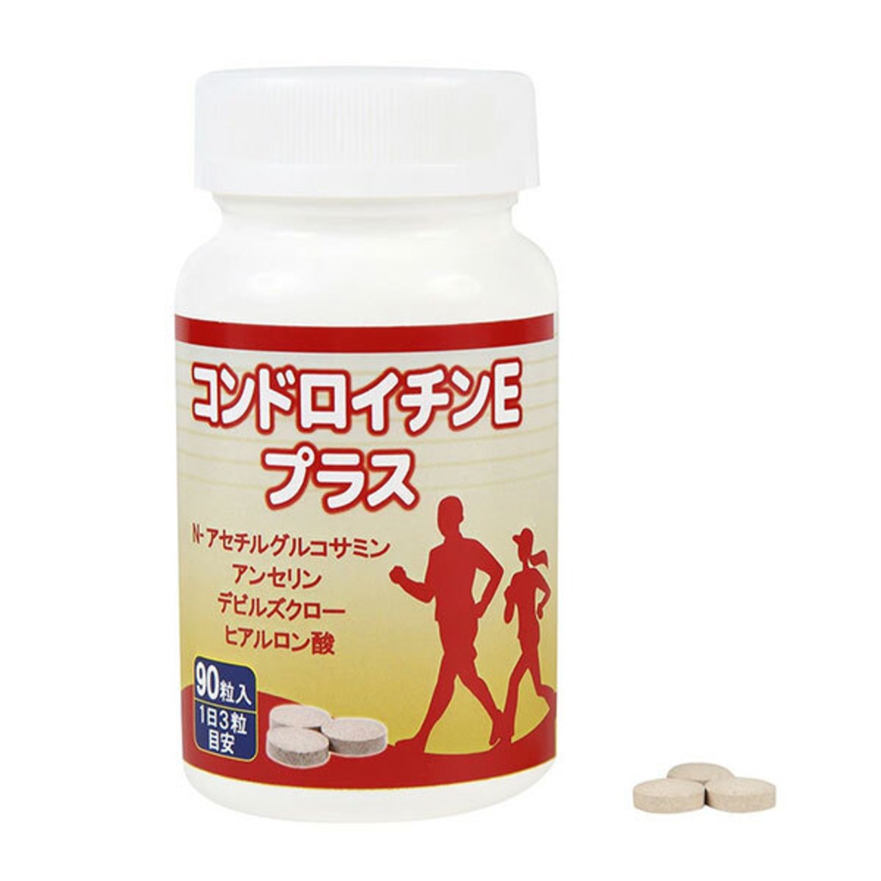 ・イカ軟骨抽出物 (コンドロイチンE含有) (国内製造)、N-アセチルグルコサミン (国内製造)、魚肉抽出物 (デキストリン、魚肉抽出物)、デビルズクローエキス、澱粉、コラーゲン (ゼラチンを含む) / 結晶セルロース、ステアリン酸カルシウム、安定剤 (HPC)、ヒアルロン酸、微粒二酸化ケイ素、リン酸三カルシウム