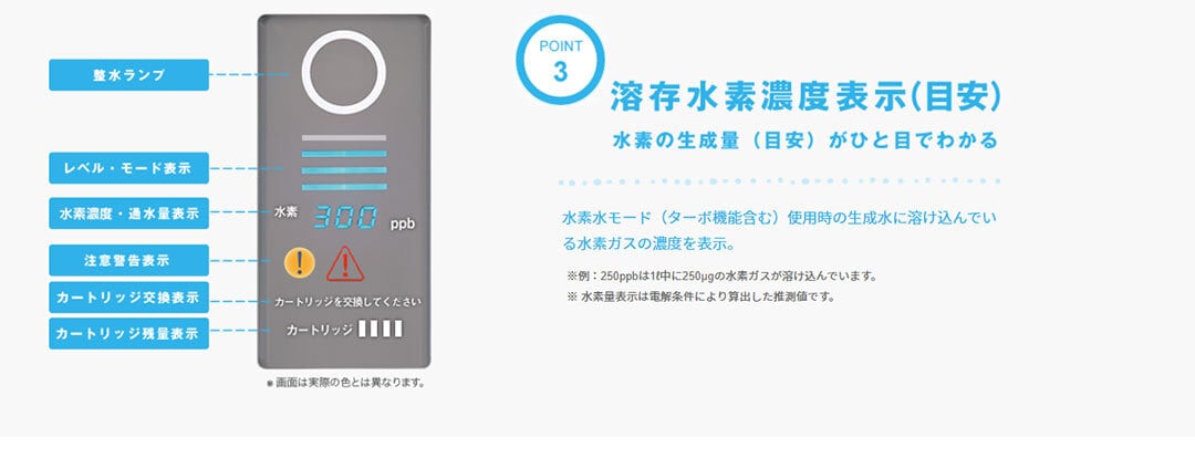 ・電解水素水:約2.5L/分・酸性水:約2.5L/分・浄水:約3L/分