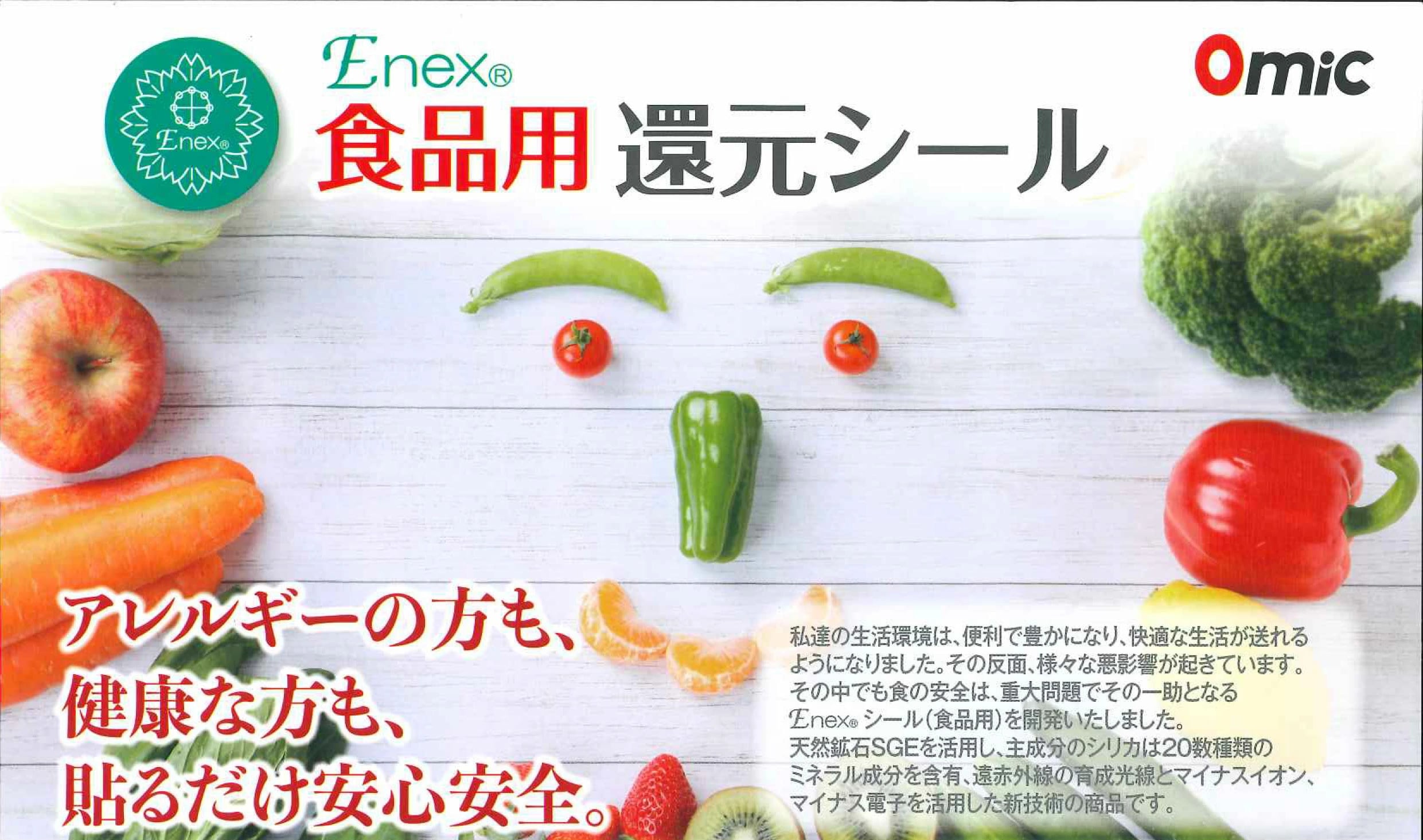 Enex食品用還元シールは、天然鉱石SGEを活用し、主成分のシリカは20数種類のミネラル成分を含有、遠赤外線(育成光線)、マイナスイオン、ソマチッド、言霊(コトダマ)等の相乗作用が期待でき、食品の添加物、農薬、環境ホルモンなどの有害性を軽減し、鮮度が保持されます。また、食品そのものの味も美味しくなります。
